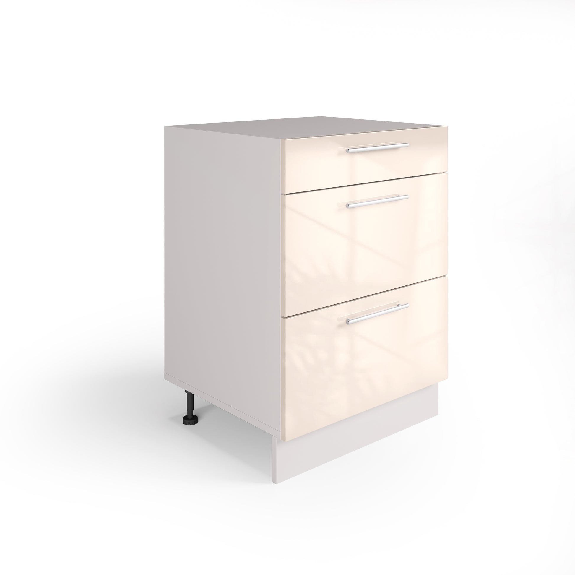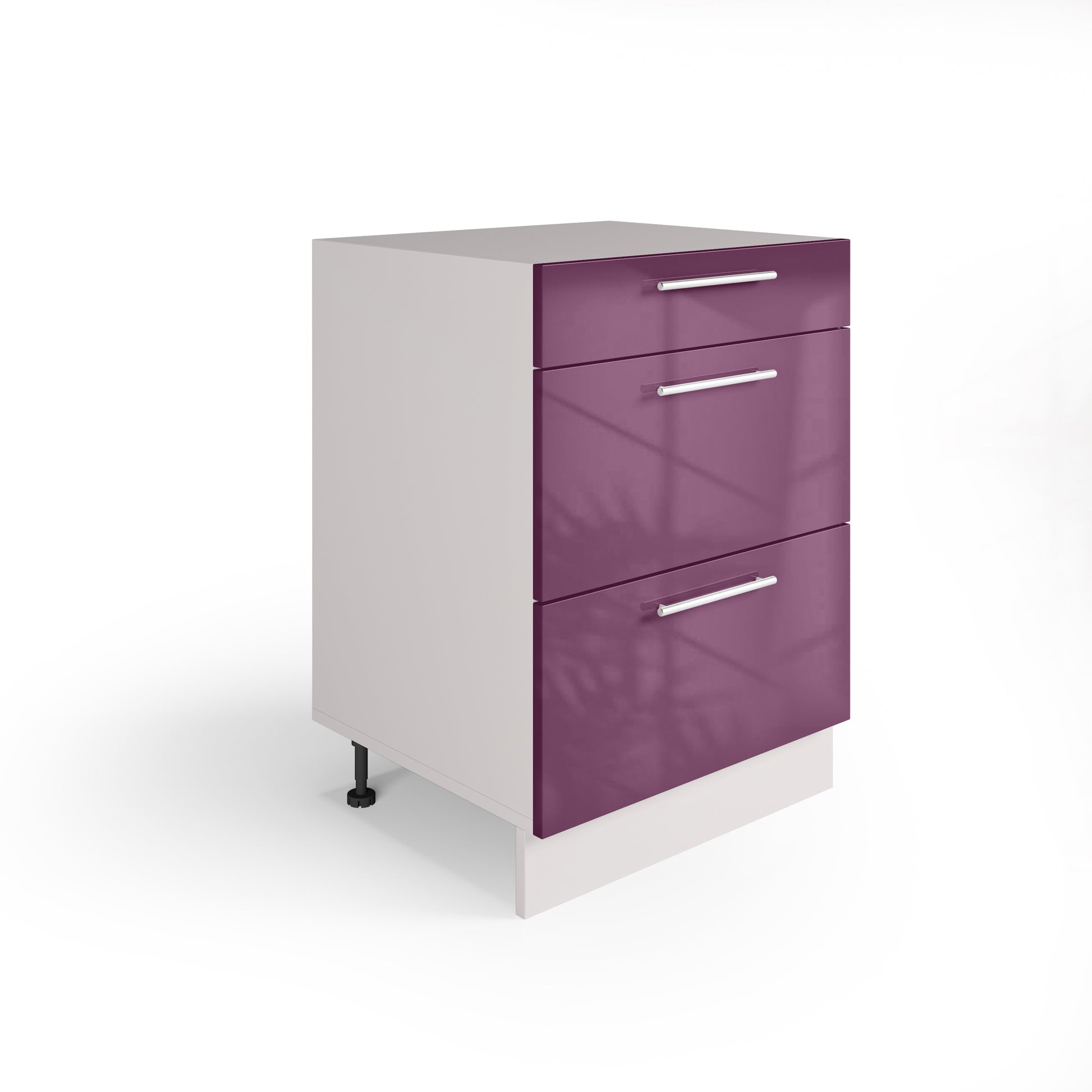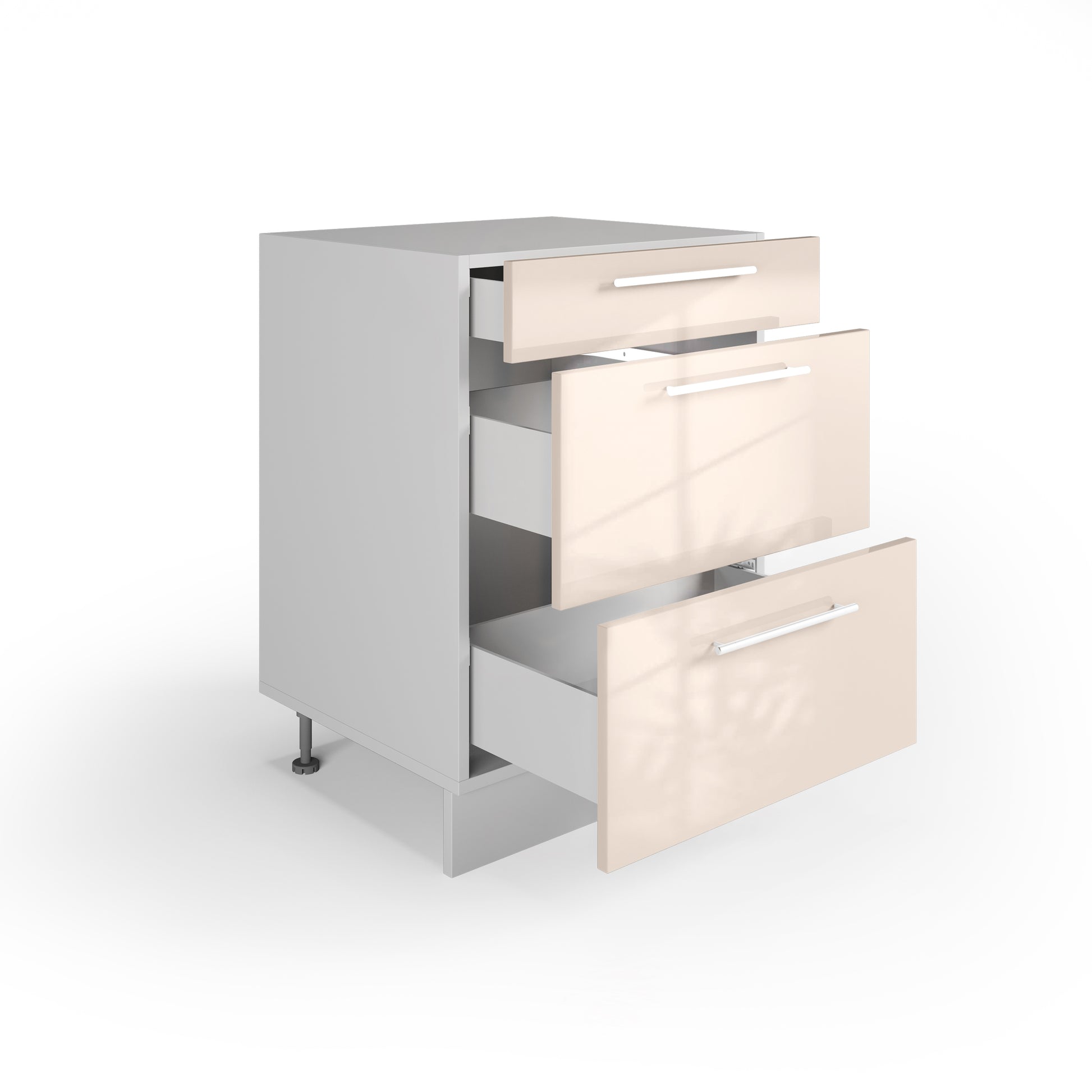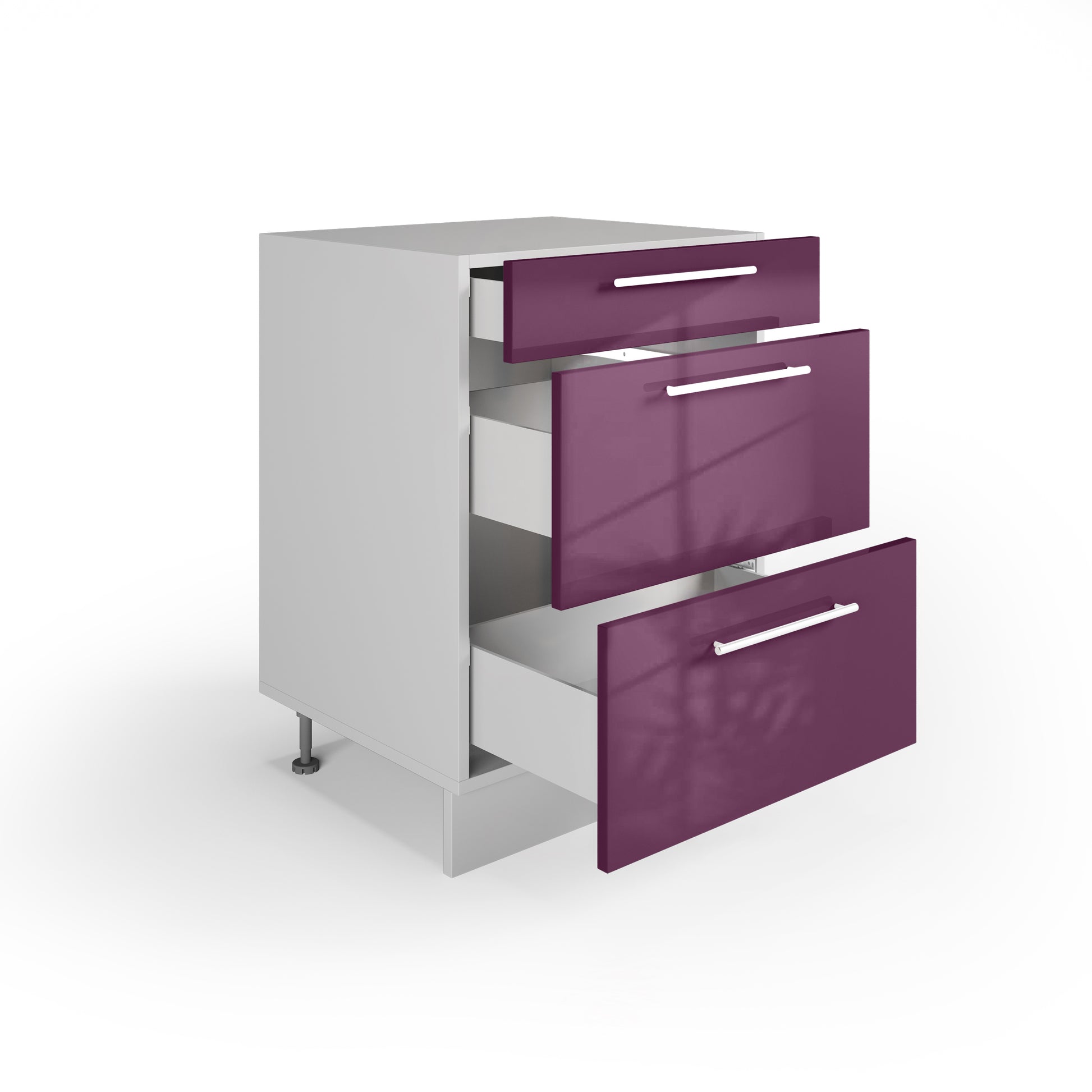 Profitez d'un agencement de cuisine pratique avec ce meuble bas de 60 cm, équipé de 3 tiroirs à fermeture silencieuse. Organisez votre espace de façon efficace et silencieuse grâce à ce meuble de cuisine fonctionnel. Afin de faciliter le passage de la tuyauterie, il est recommandé de prévoir un vide sanitaire de 8 à 10 cm.