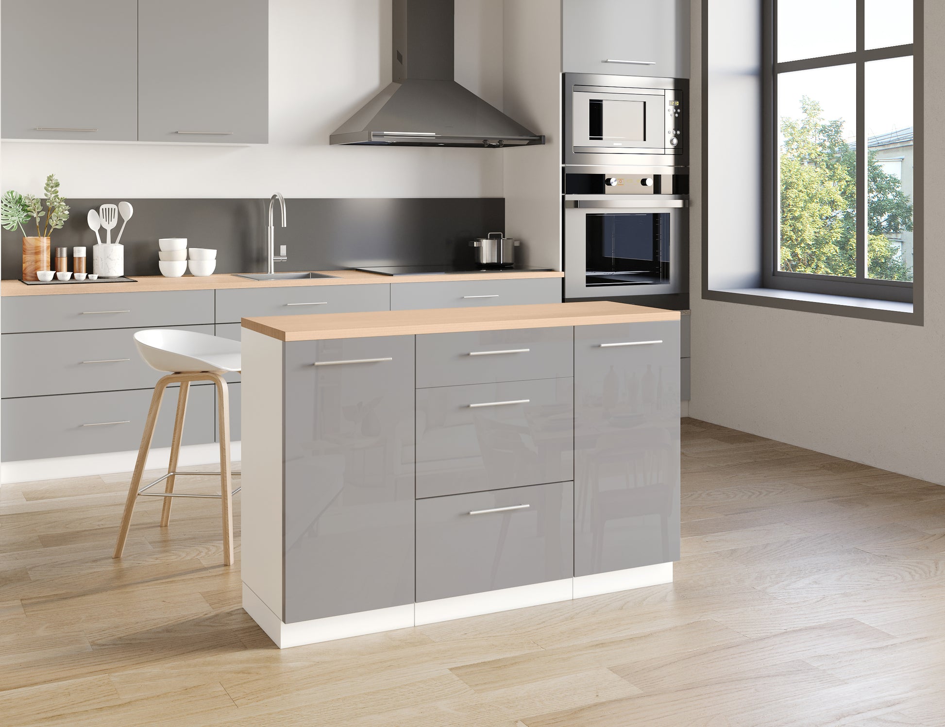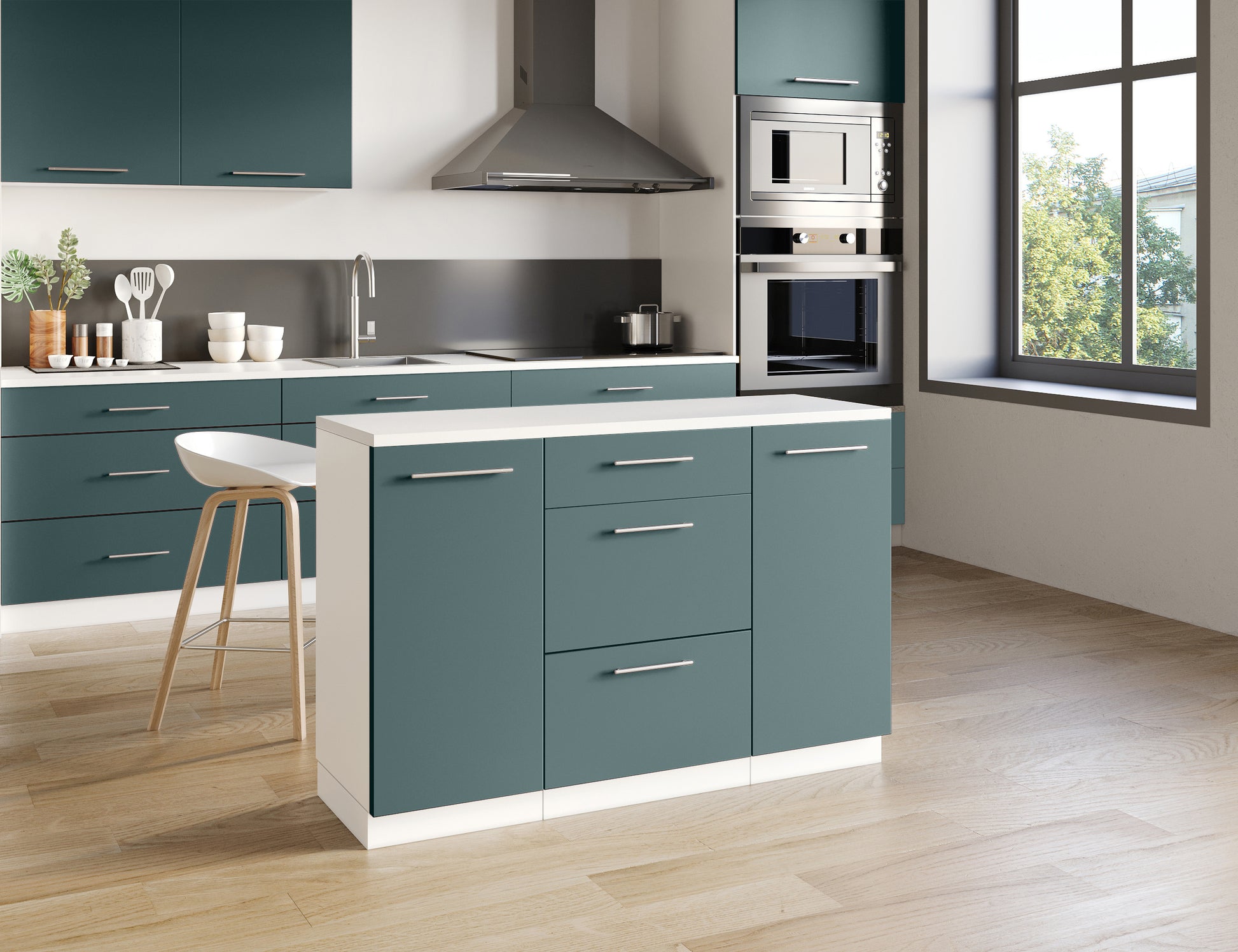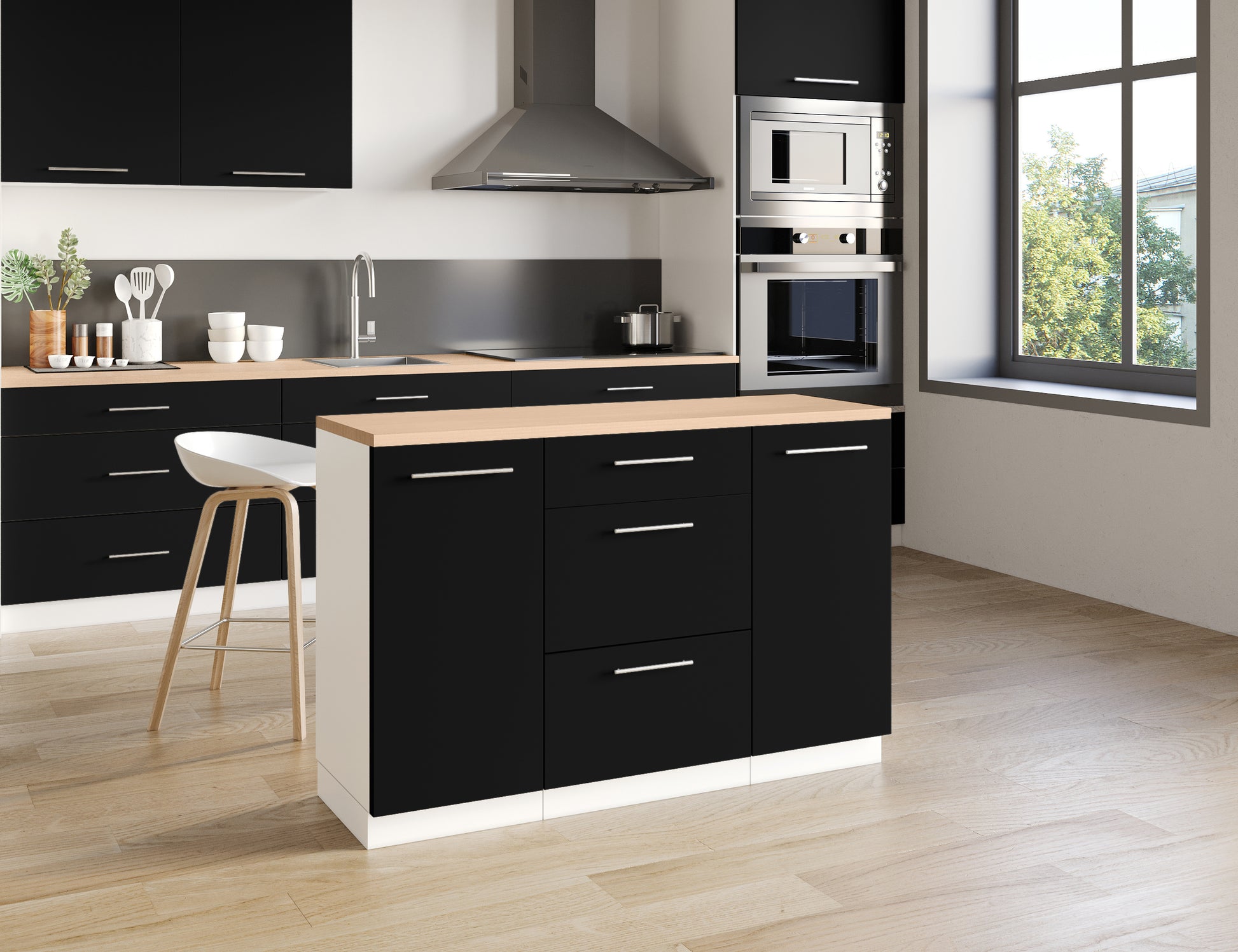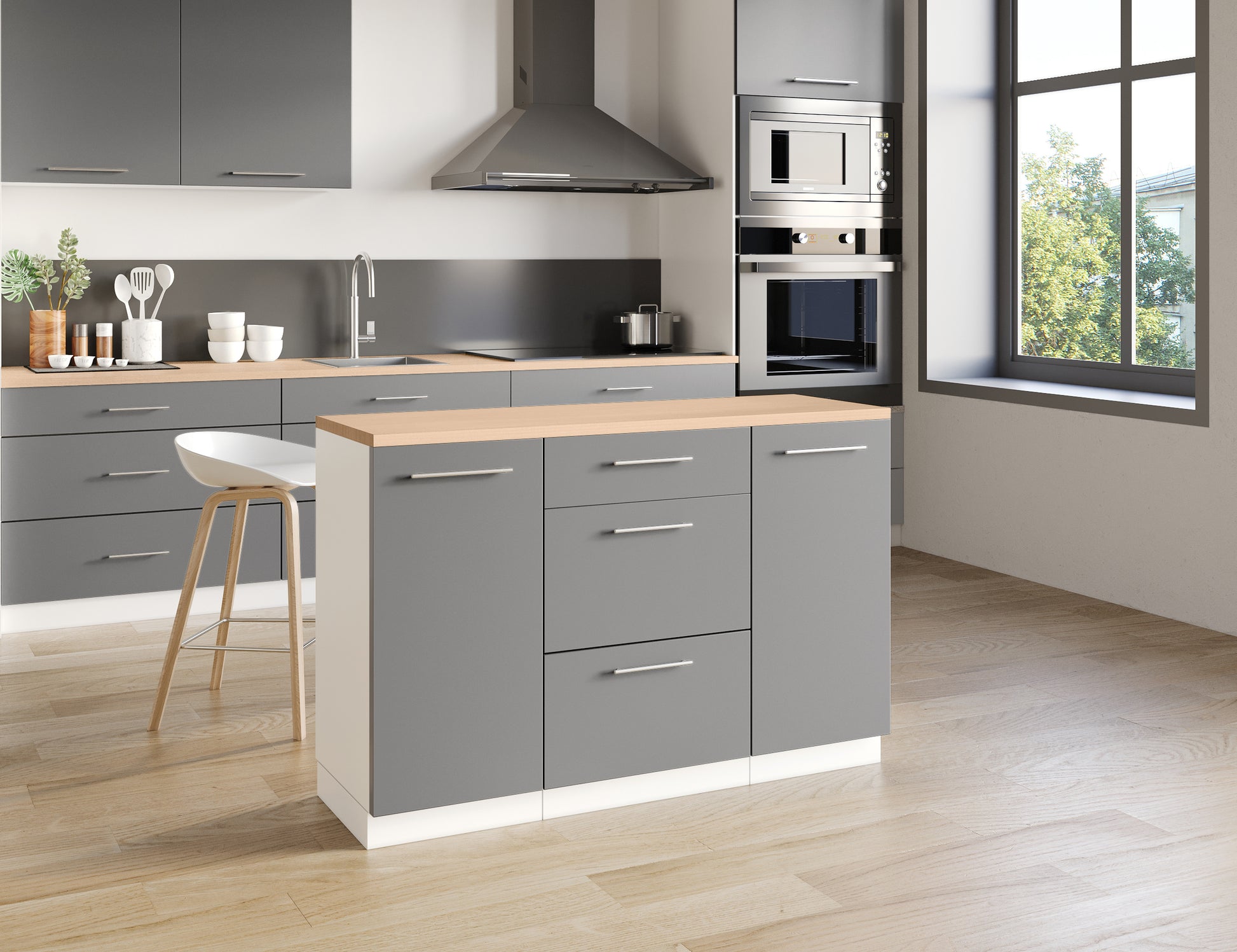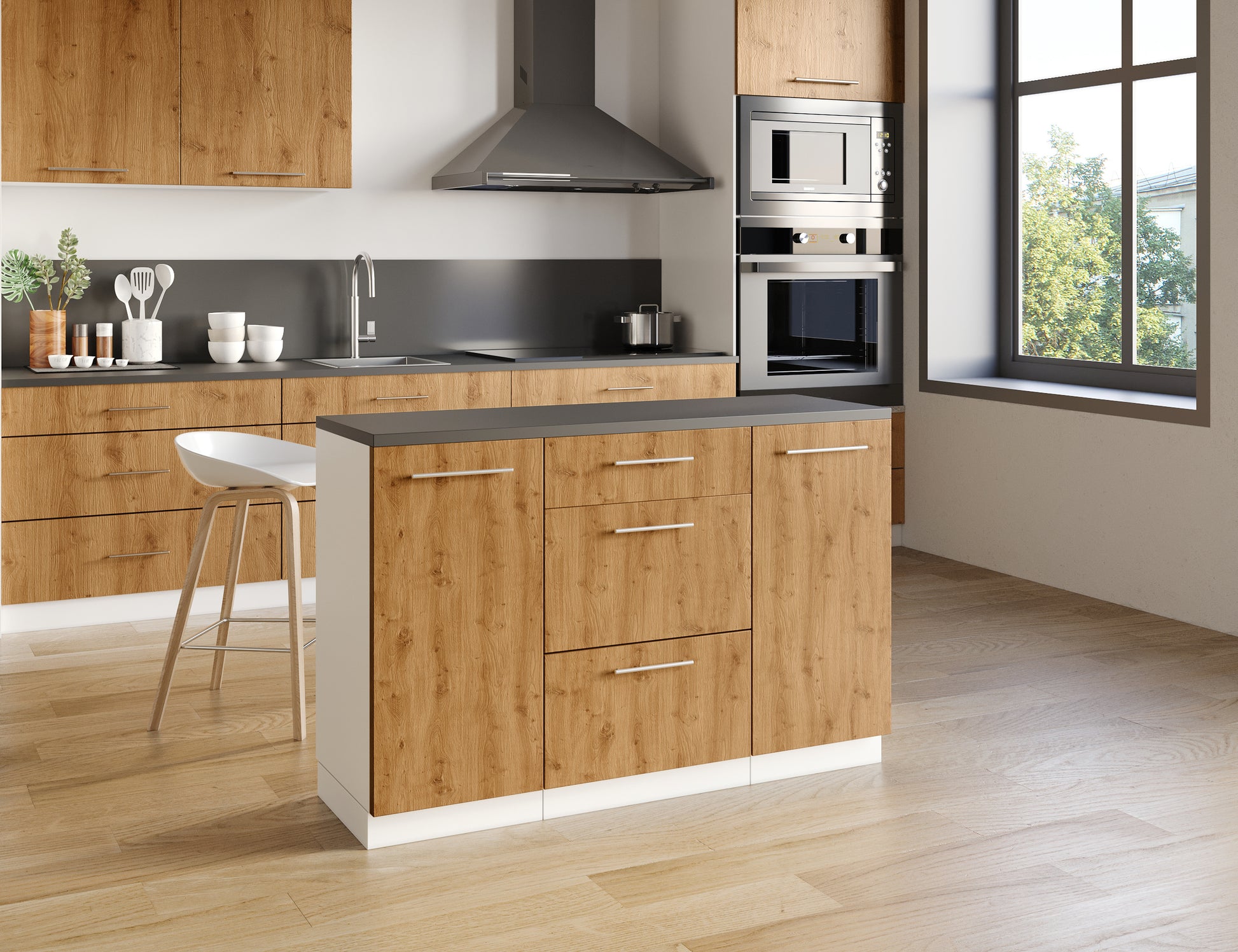 Notre îlot central de cuisine se compose de 3 meubles bas, adapté à une configuration d'îlot de 140x50 cm.
