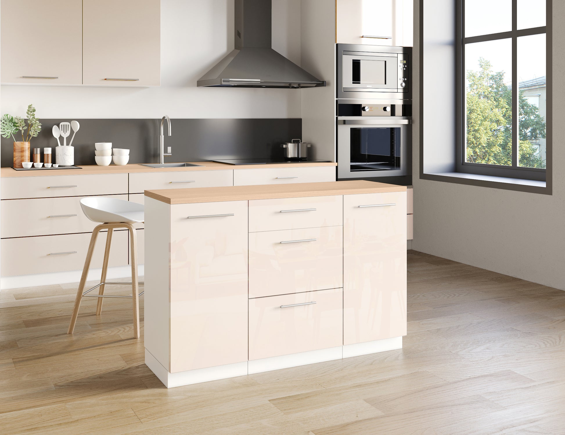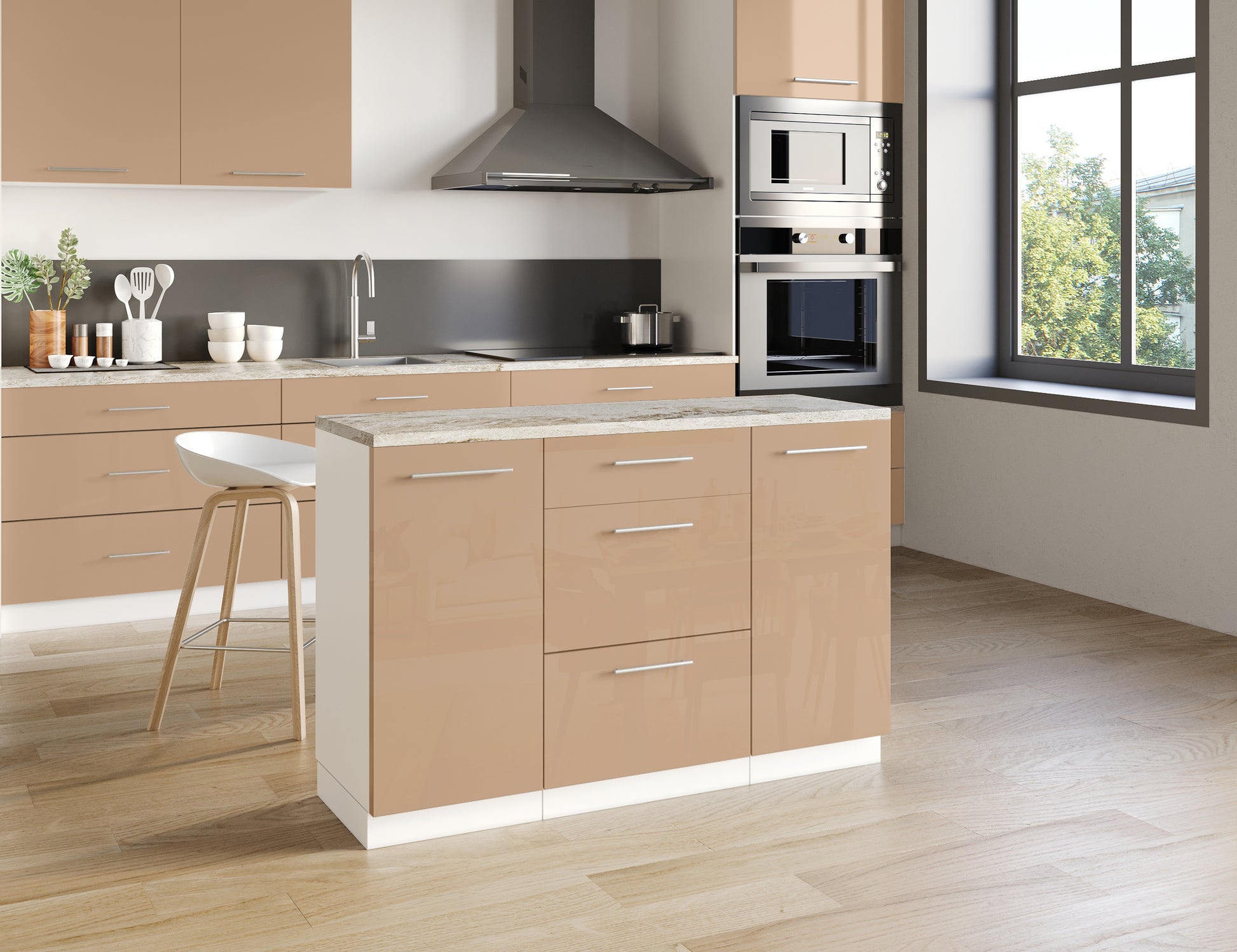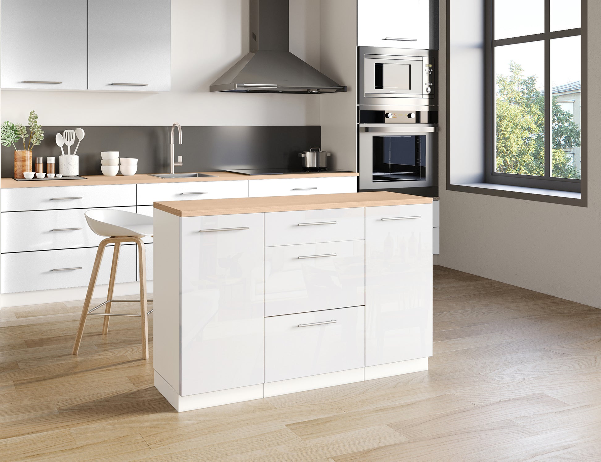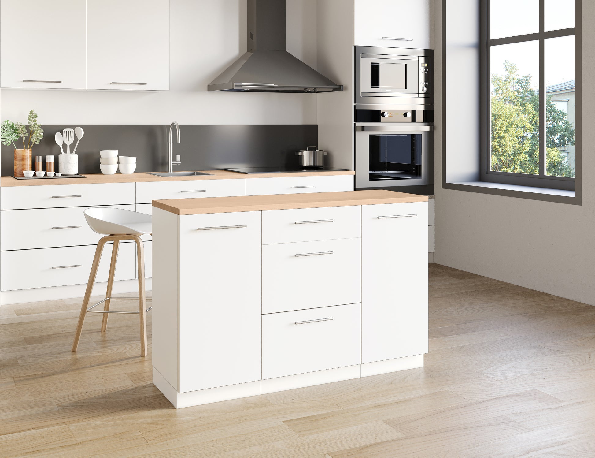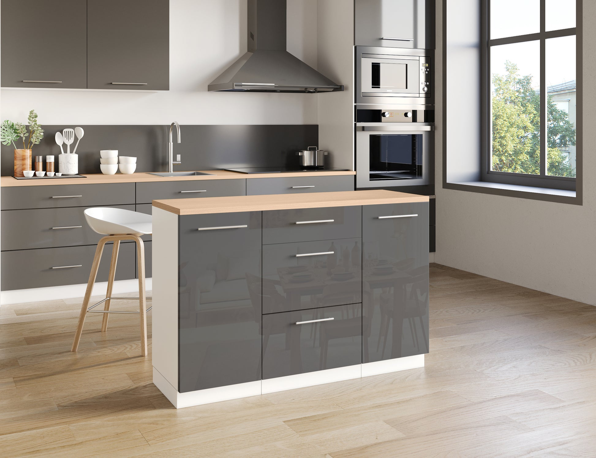 Notre îlot central de cuisine se compose de 3 meubles bas, adapté à une configuration d'îlot de 140x50 cm.